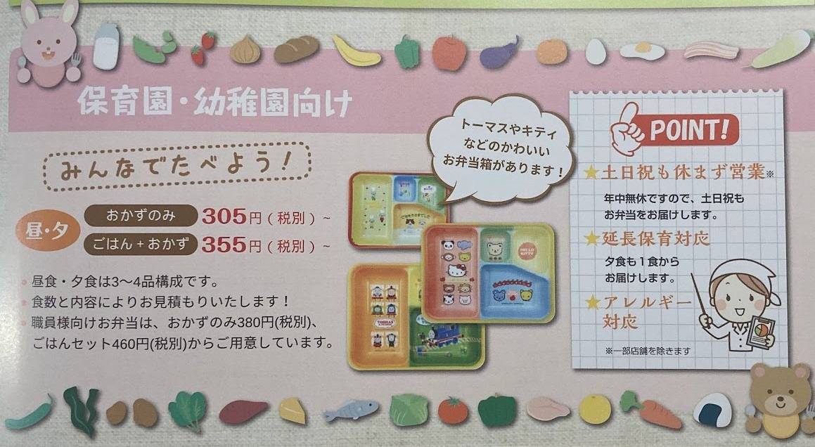 秦野市内の介護・福祉施設様、幼稚園・保育所様向けに調理済みの食材やお弁当を提供させていただいております!